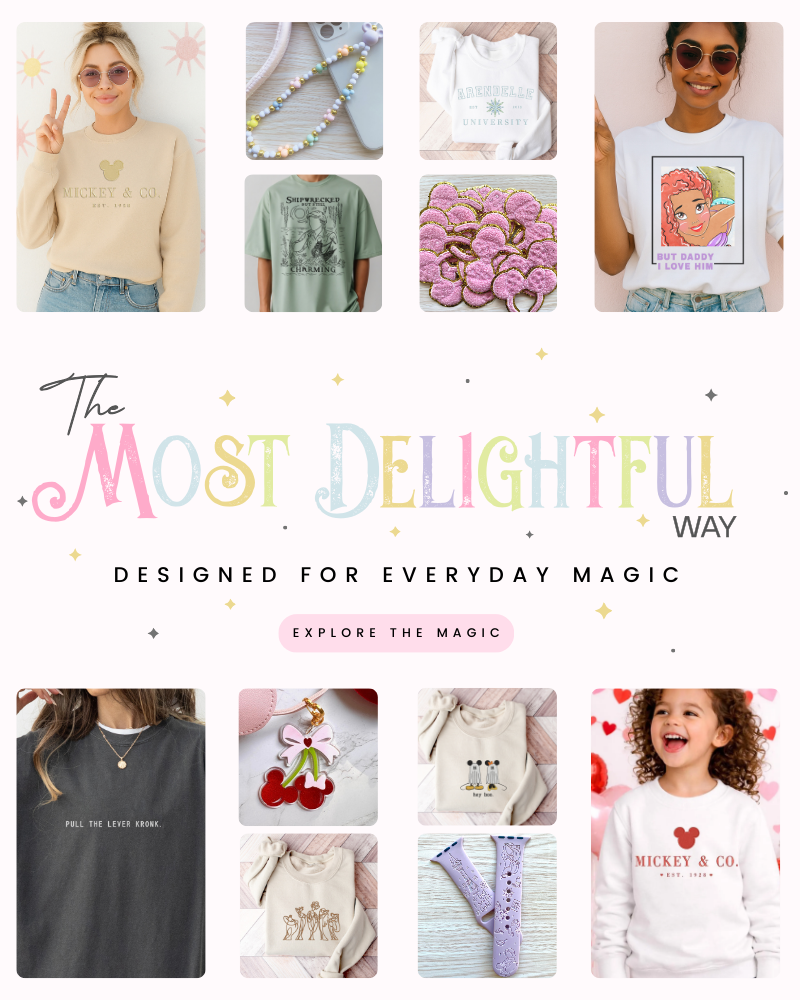 I design dreamy Disney inspired sweaters, tees, and accessories for the modern fan. Whether you're strolling through the parks or just channeling a little everyday magic, our pieces are cozy, subtle, and stylish, because nostalgia deserves a grown up glow up. Created for fans, by a fan. Always hand made. Always magical.