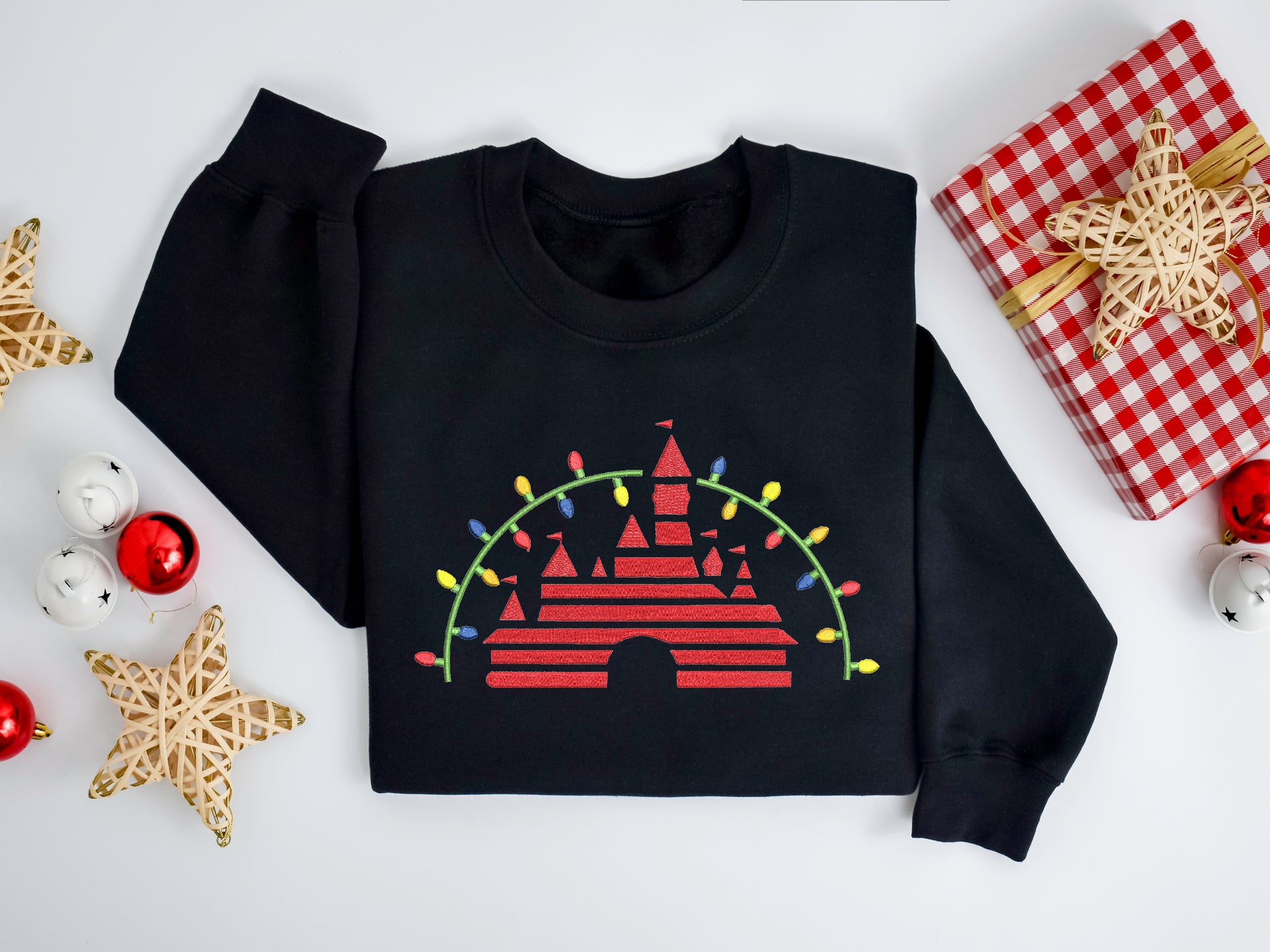 ✔ Embroidered castle wrapped in twinkling holiday lights