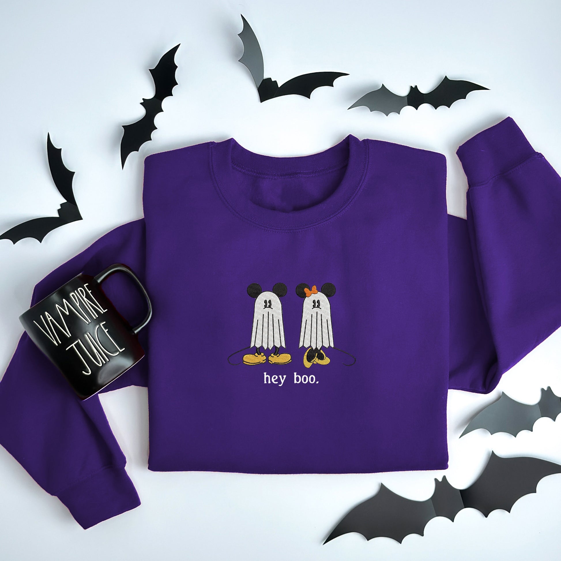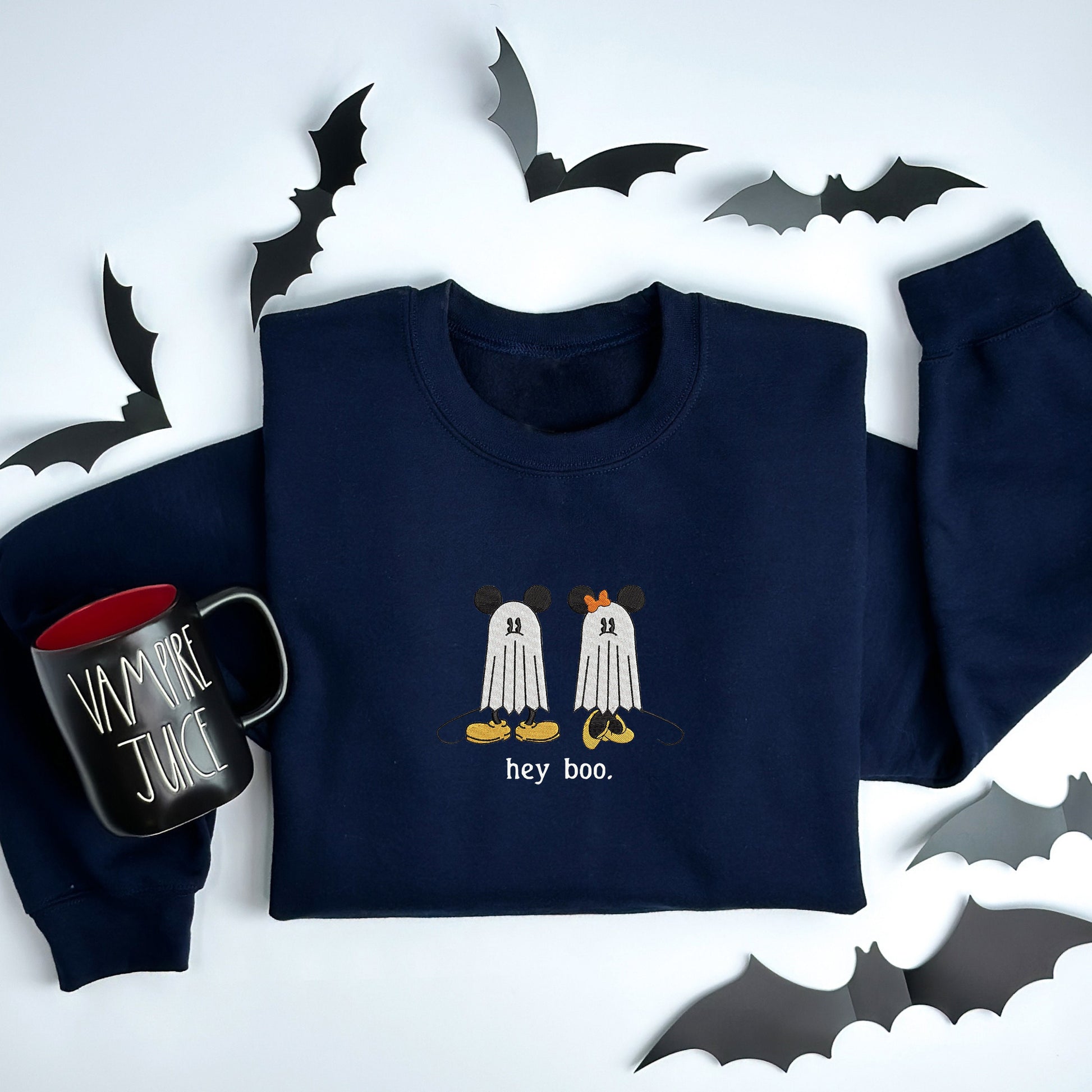 Bring the spooky sweetness to your fall wardrobe with this cozy sweater featuring ghostly mouse ears and the playful phrase "hey boo." Perfect for adding a touch of Halloween magic while keeping things cute and cozy.