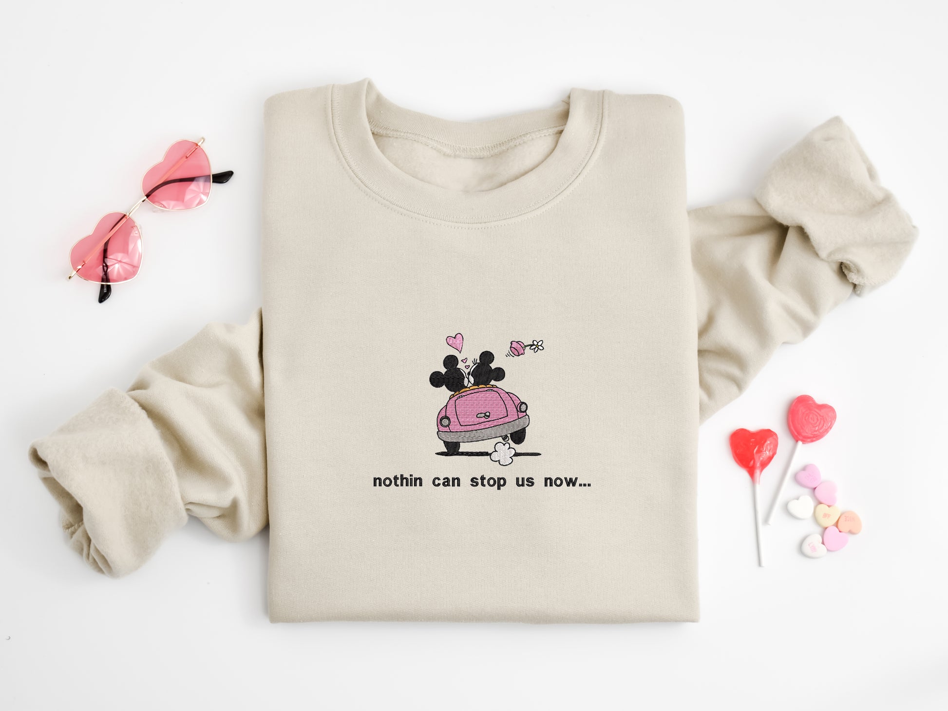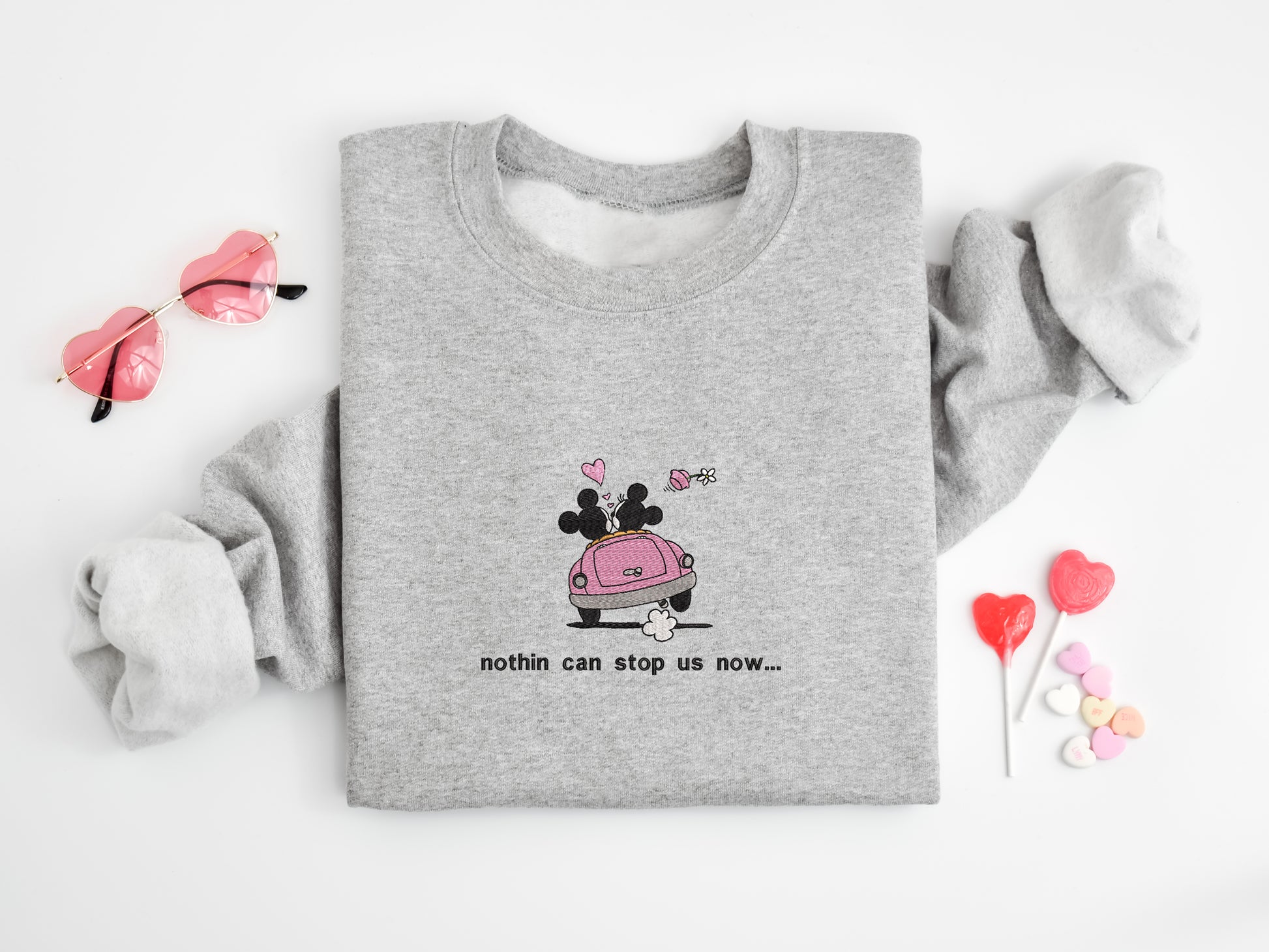 Inspired by the joyful spirit of Mickey & Minnie’s Runaway Railway, this sweatshirt captures pure, unstoppable love. Featuring an embroidered style pink car design with the iconic duo cruising into their next adventure, this cozy piece blends playful nostalgia with Valentine’s Day charm. Perfect for park days, road trips, or simply celebrating your favorite partner in crime.